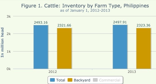 The total cattle inventory in the country as of January 1, 2013 was almost 2.50 million heads. This was 0.19 percent higher than last year’s record of 2.49 million heads. Of the total inventory, about 2.32 million heads or 93.00 percent were raised in backyard farms. The remaining 7.00 percent or about 0.17 million head were raised in commercial farms.