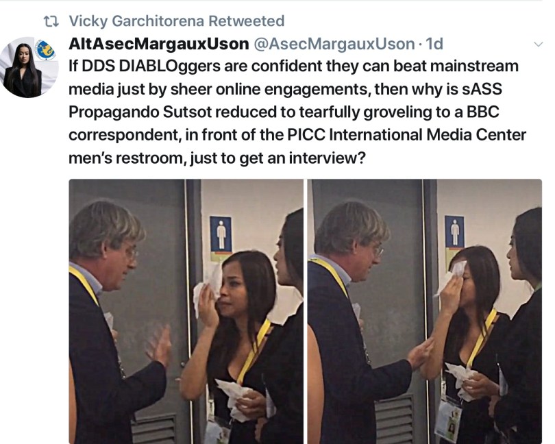 November 14, 2017 1312 × 1051 Duterte Critic Vicky Garchitorena Freaks Out Over BBC-Sasot Confrontation In Front Of Men’s Restroom