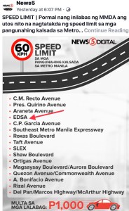 This time, MMDA has issued a new directive setting the speed limit on many roads and highways in the metropolis to 60 Kilometers per hour.