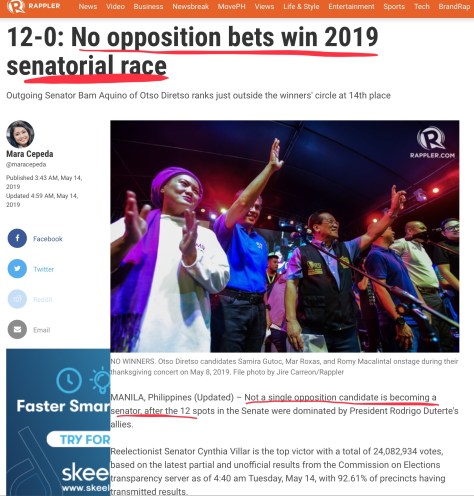 Rappler reported: “Not a single opposition candidate is becoming a senator…”