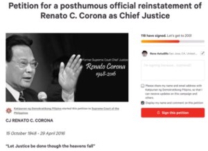 MANILA, Philippines (The Adobo Chronicles, Manila Bureau) – President Rodrigo Duterte has issued an Executive Order posthumously reinstating the impeached, Renato Corona as Chief Justice of the Philippine Supreme Court.