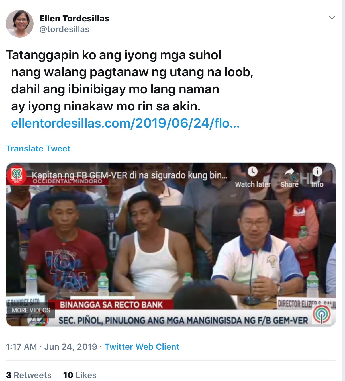 June 23, 2019 1211 × 1338 Ellen Tordesillas Says P50K Given By VP Robredo To Fishermen Is Bribe And Stolen Money