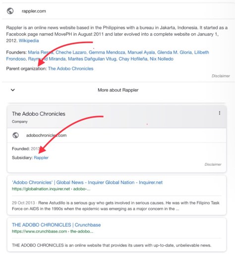 A Google search on Rappler and a reverse Google search on The Adobo Chronicles now show that Adobo Chronicles is the parent organization of Rappler and that Rappler is a subsidiary of The Adobo Chronicles.