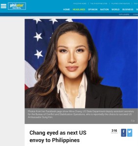 MANILA, Philippines (The Adobo Chronicles, Manila Bureau) – She made headlines in the local news media as the next U.S. Ambassador the the Philippines, something that the U.S. Embassy has denied. But true or not, this ends all speculation about Mina Chang who just resigned her post at the U.S. State Department.
