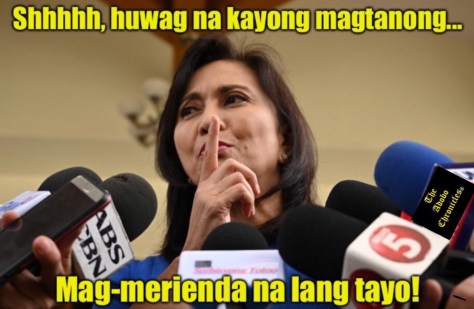 In her usual modus operandi in evading difficult questions, Robredo chided the reporters to stop asking questions and instead join her for some afternoon snacks.