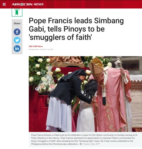 Francis, in his message during the Vatican Simbang Gabi, told Pinoys to be ‘smugglers of faith.’