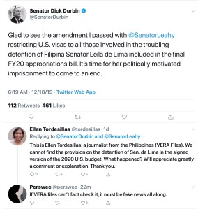 MANILA, Philippines (The Adobo Chronicles, Manila Bureau) – We’ve all been waiting for Vera Files to fact-check news reports that the 2020 Appropriations Acts recently signed by President Donald Trump included a provision that would ban the entry into the U.S. of Philippine officials and others responsible for the alleged wrongful detention of Senator Leila De Lima. We’re all still waiting.