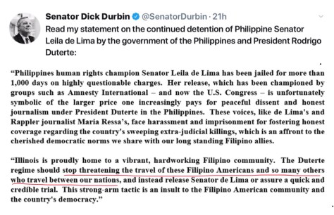 Earlier, in a tweet expressing his support for the jailed Senator Leila De Lima, Durbin urged Philippine President Rodrigo Duterte “to stop threatening the travel” of Filipino Americans and so many others who travel between the U.S. and other nations.