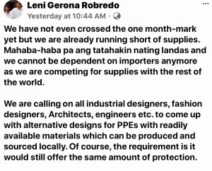 QUEZON CITY, Philippines (The Adobo Chronicles, Quezon City Bureau) – In a post on her Facebook page, Philippine Vice President Leni Robredo called on Filipino “industrial designers, fashion designers, Architects, engineers etc. to come up with alternative designs for PPEs with readily available materials which can be produced and sourced locally.”