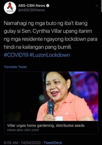 For her part, Senator Cynthia Villar has urged Filipinos to plant vegetables in their backyard so that they don’t have to go out and buy their food. She has distributed vegetable seeds.