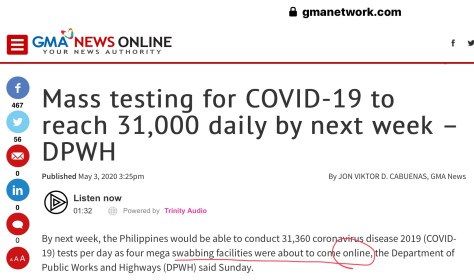 The good news came during a GMA News interview witn an official of the Department of Public Works and Highways (DWPH) who said the Philippines would now be able to conduct 31,600 coronavirus tests per day by next week.