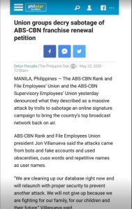 QUEZON CITY, Philippines (The Adobo Chronicles, Quezon City Bureau) – The ABS-CBN Rank and File Employees’ Union and the ABS-CBN Supervisory Employees’ Union have denounced efforts to sabotage their online petition asking legislators to renew their network’s broacasting franchise.