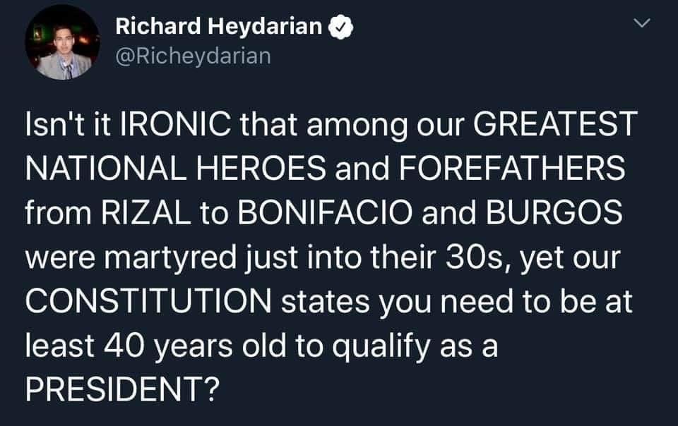 This, after Heydarian posted a comment on his Twitter account that national heroes and forefathers were martyred into their 30s while a candidate for President of the Philippines needed to be at least 40 years old to qualify.