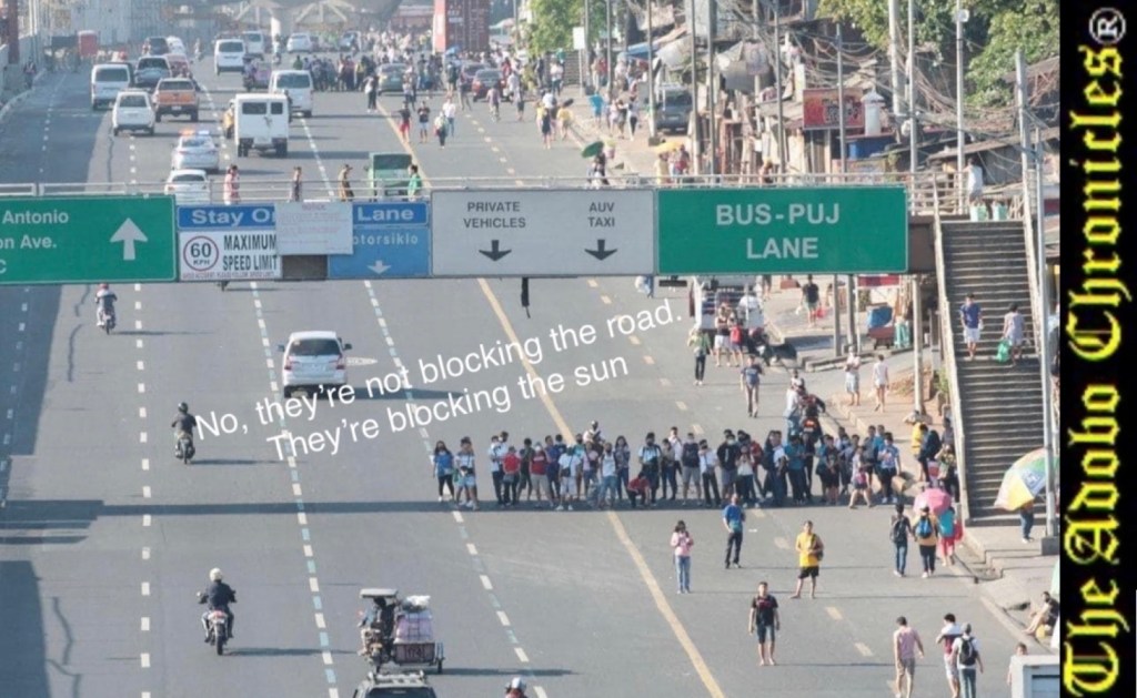 MANILA, Philippines (The Adobo Chronicles, Manila Bureau) – As part of its no-nonsense campaign to rid Metro Manila’s roads and highways from traffic obstruction, agents of the Metro Manila Development Authority (MMDA) yesterday arrested dozens of Filipino commuters for blocking a major thoroughfare (see photo).