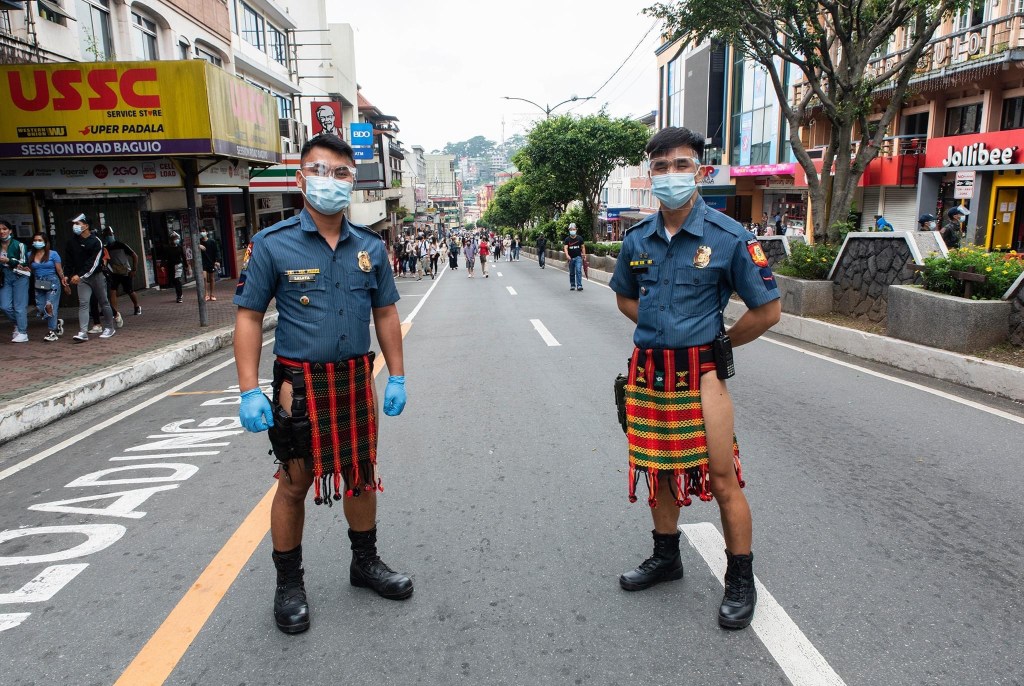 As seen in the photo, taken along the city’s main thoroughfare, Session Road which is closed to vehicular traffic on Sundays, police officers wear their PPEs with pride: face mask, face shield, hand gloves and g-string.