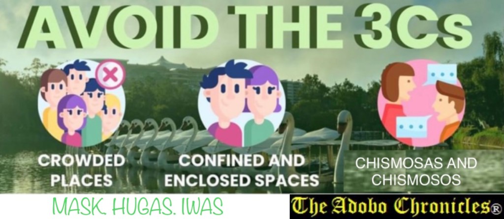In its new, improved public service ad, PCOO is encouraging Filipinos to avoid the “3 C’s,” of avoiding Crowded places, Confined and enclosed spaces, and Chismosas and Chismosos (gossips).