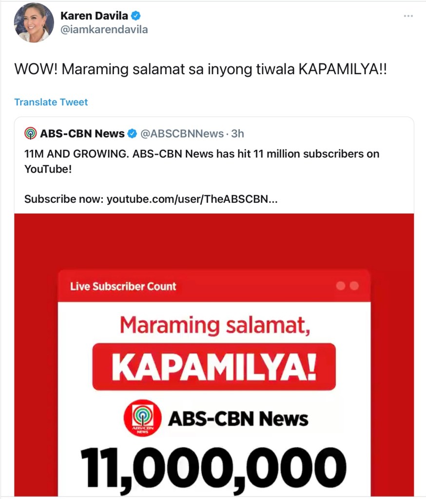 ABS-CBN loyalist Karen Davila announced on her Twitter account that her defunct network now has 11 million subscribers to its YouTube channel.