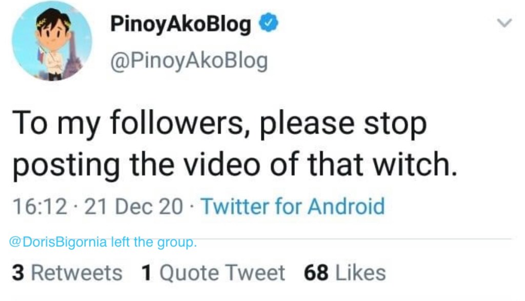 ABS-CBN reporter Doris Bigornia has reacted violently to a tweet by Pinoy Ako Blog’s Jover Laurio who asked her followers to stop posting a video of that “witch.”