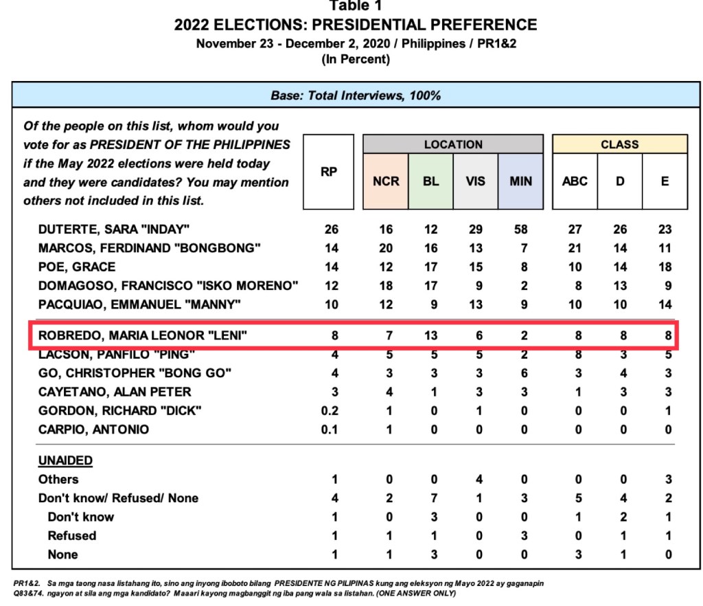 Robredo trailed Sara Duterte, Bongbong Marcos, Grace Poe, Isko Moreno and Manny Pacquiao.