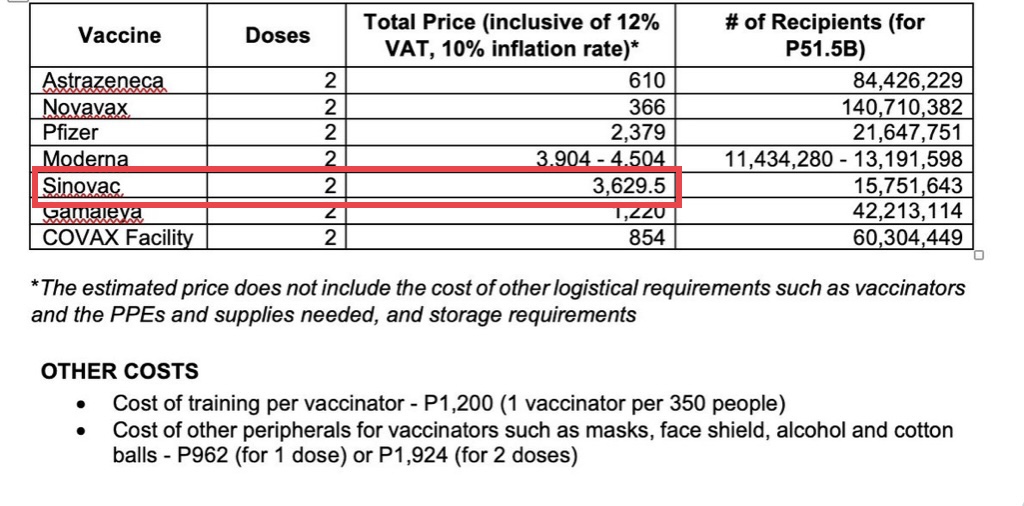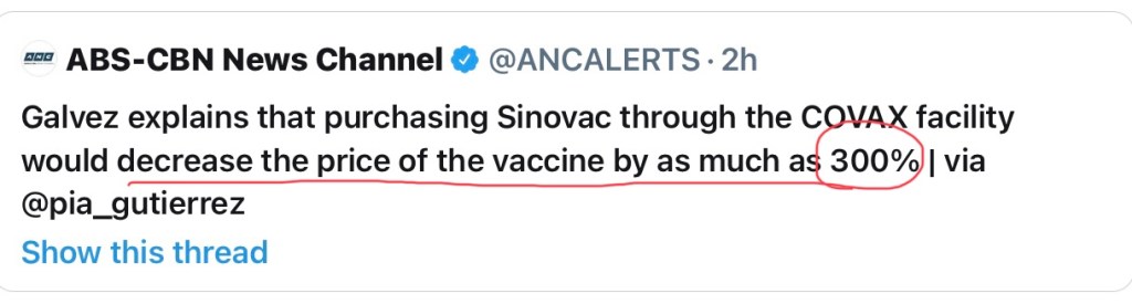 ABS-CBN is reporting that Vaccine Czar Secretary Carlito Galvez said that purchasing Sinovac through the COVAX facility would decrease the price of the vaccine by as much as 300%.