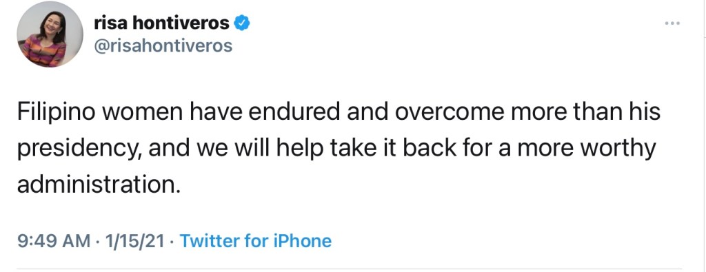 In a post on her Twitter account, Hontiveros said that women will take back the Presidency for a more worthy administration. She didn’t mention Sara by name, but it was obvious she was referring to the Davao City Mayor who, in a recent Pulse Asia survey, topped the list of potential Presidential candidates in 2022.