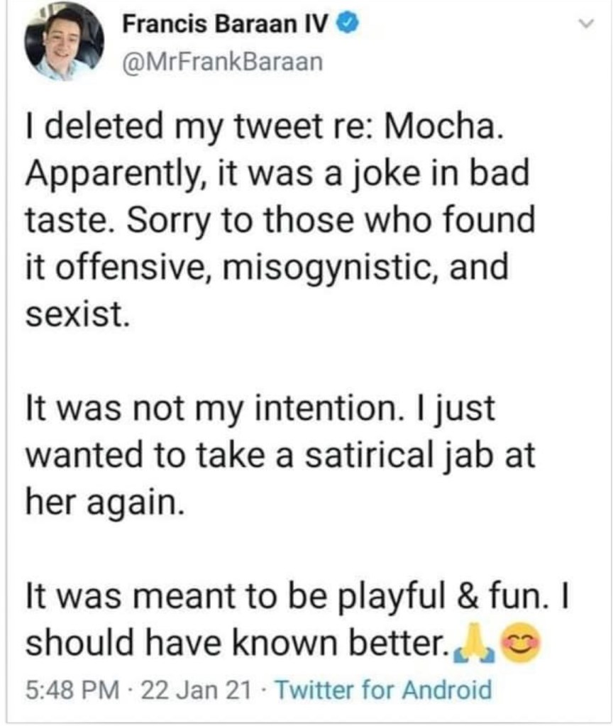 Baraan has acknowledged that it was fake news and apologized for posting it on his Twitter account. He claimed it was meant to be a “satirical jab” at Uson.