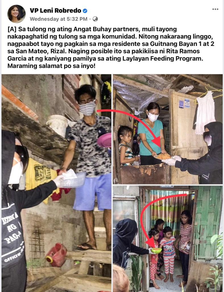 QUEZON CITY, Philippines (The Adobo Chronicles, Quezon City Bureau) – The Office of Vice President Leni Robredo has all but perfected the art of photo ops to promote its programs and initiatives, but it may have shot itself in the foot when it posted photos of its recent food distribution in San Mateo, Rizal.