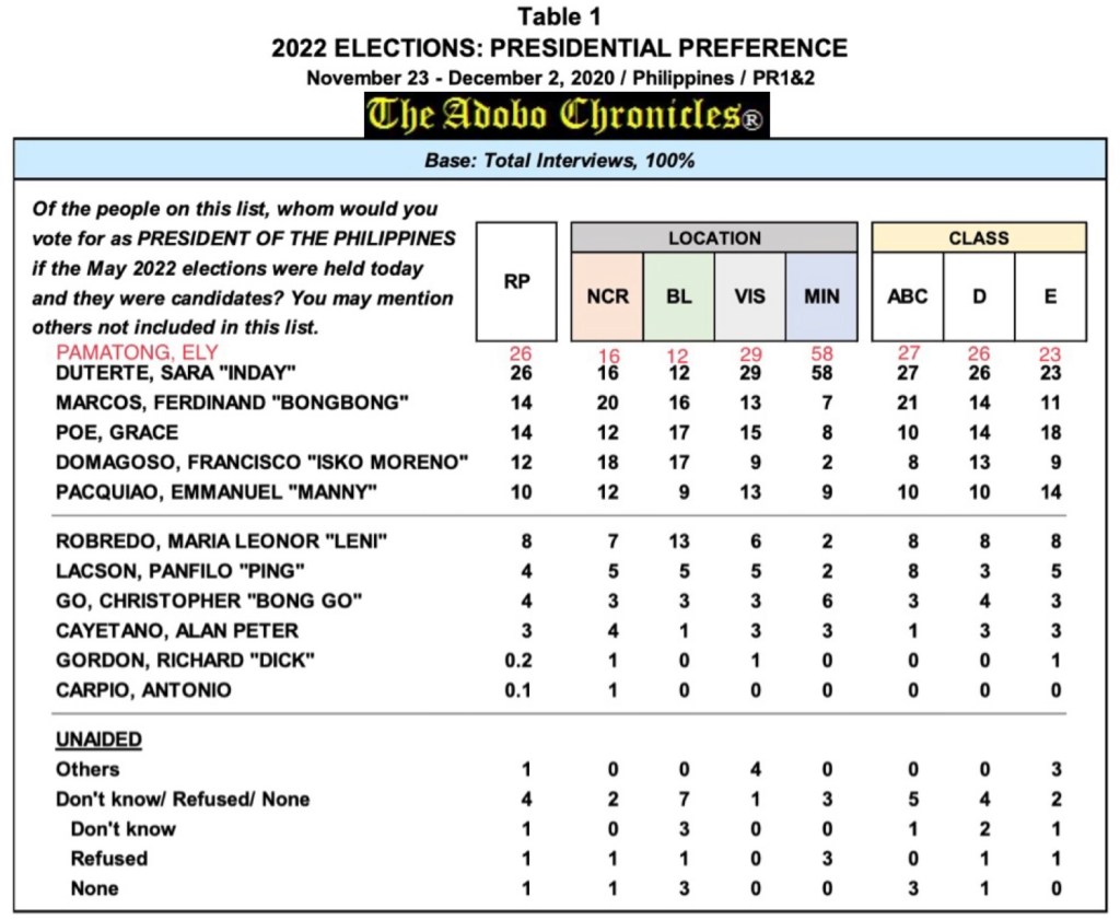A poll conducted by The Adobo Chronicles mirrors a similar survey by Pulse Asia, except for the top spot.