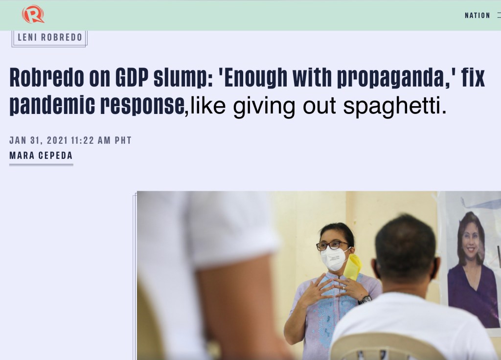 QUEZON CITY, Philippines (The Adobo Chronicles, Quezon City Bureau) – Vice President Leni Robredo chided the Duterte Administration for what she called government “propaganda” in dealing with the country’s problems, including the decline in Gross National Product (GDP).
