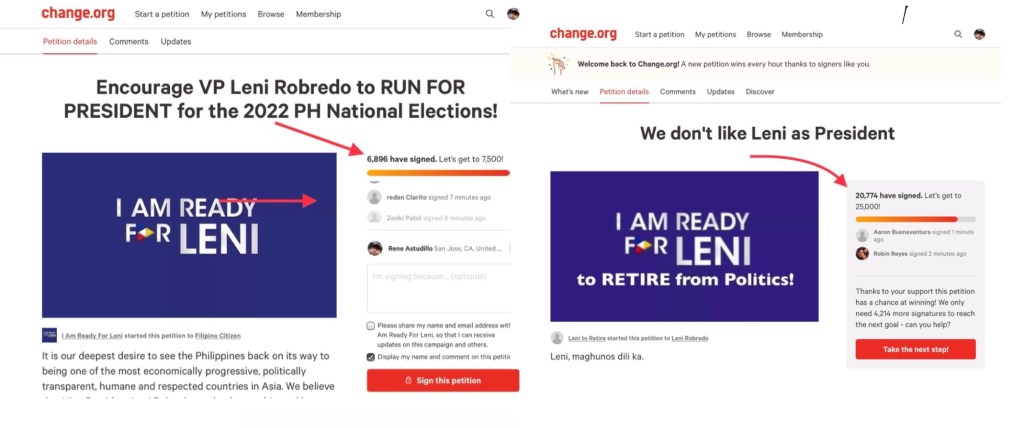 An online petition on change.org was recently set up by those who want to draft Robredo to be their Presidential candidate in 2022. As of this writing, some 6,000+ signatures have been gathered.