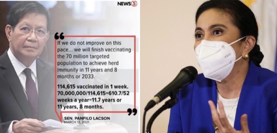 Robredo, who has popularized the equation “40×4=1,600,” is criticizing a recent statement by Lacson regarding the status of the country’s Covid-19 vaccination program.