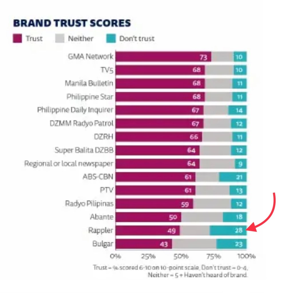 The survey, conducted by the Reuters Institute for the Study of Journalism (RISJ) at Oxford University, indicated that Rappler is the second to the last trusted media brand among Filipinos, just one spot ahead of the tabloid Bulgar.