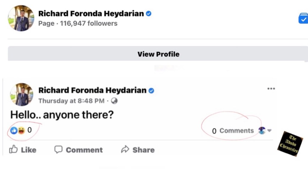 To confirm the phenomenon, Heydarian posted a question on his FB page: “Hello, is anyone there?” He waited and waited and waited, but there was zero response — zero likes and zero comments.