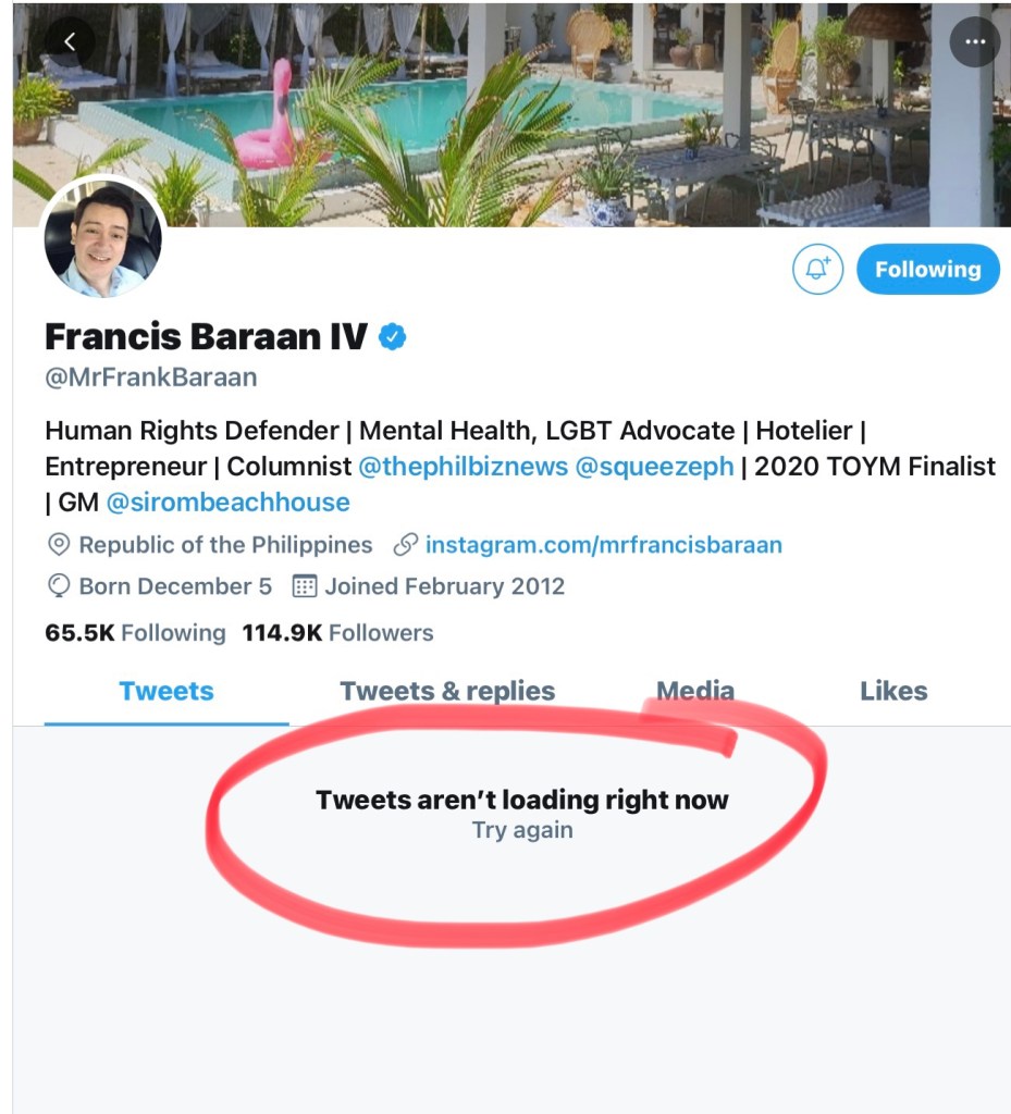 MANILA, Philippines (The Adobo Chronicles, Manila Bureau) — First, we reported that GMA News’ self-imposed political analyst Richard Heydarian mysteriously lost all his followers to his Twitter account. Now, another anti-Duterte media socialite Francis Baraan IV has lost — not his followers — but all his tweets!