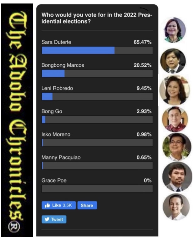 MANILA, Philippines (The Adobo Chronicles, Manila Bureau) – The results of The Adobo Chronicles’ Presidential Poll of Polls are in and Davao City Mayor and Presidential Daughter Sara Duterte leads the pack, with a whopping 65.47%.