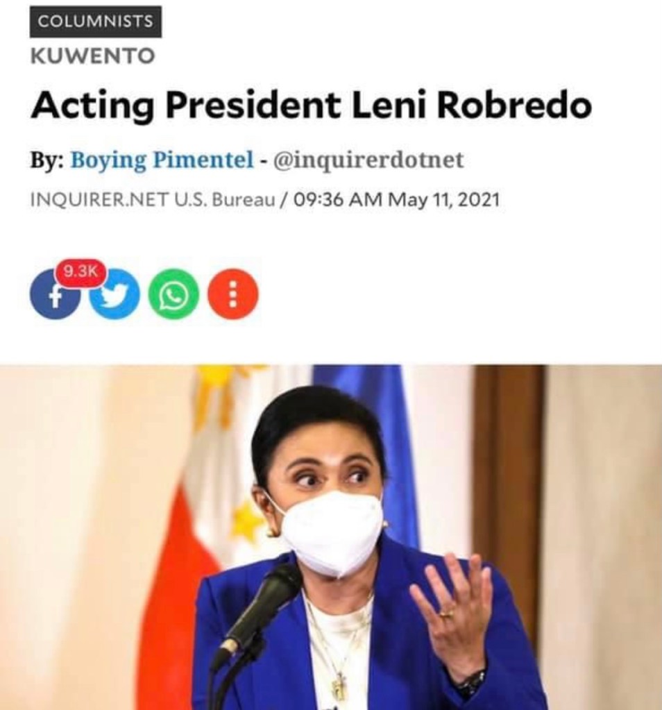 MANILA, Philippines (The Adobo Chronicles, Manila Bureau) – Inquirer USA has all but designated Leni Robredo as Acting President of the Philippines, thanks to an opinion piece penned by Ben “Boying” Pimentel.