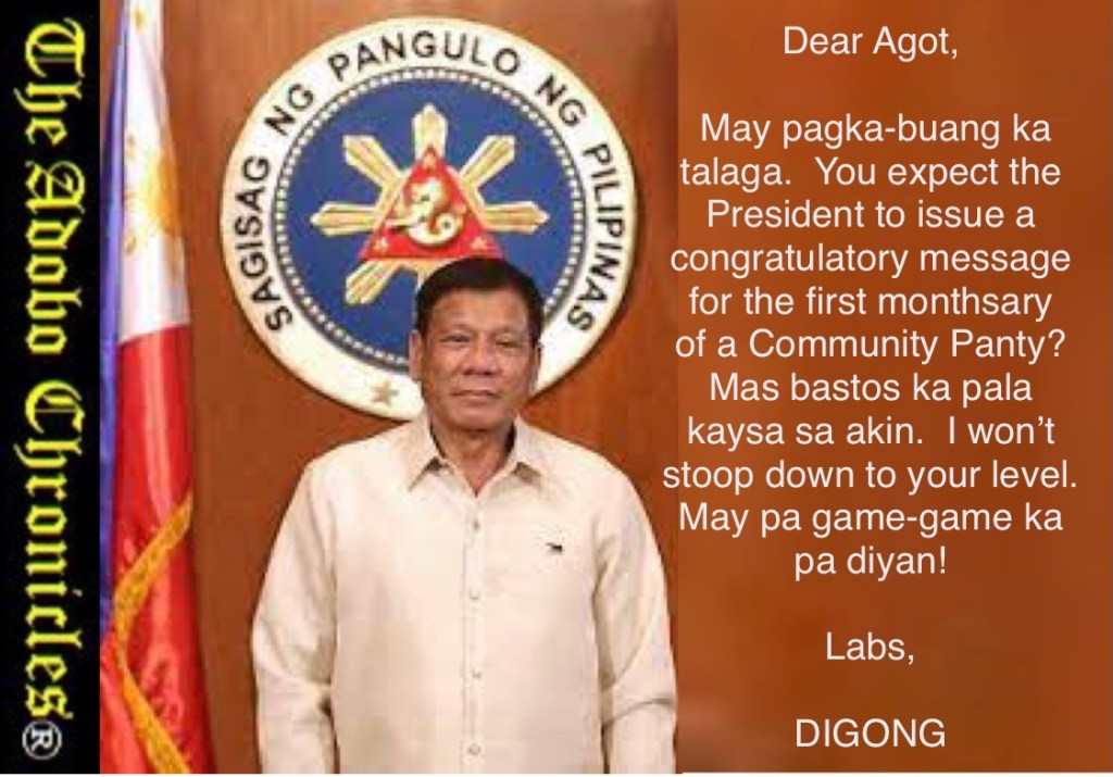 MANILA, Philippines (The Adobo Chronicles, Manila Bureau) – On the occasion of the first-month anniversary of the launch of the community pantry, actress and known member of the political Opposition Agot Isidro challenged President Rodrigo Duterte to issue a congratulatory greeting.