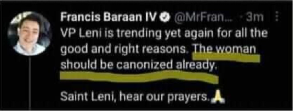 The lawsuit stems from a tweet by Baraan in which he said that Robredo should be canonized as a saint. He even asked Saint Leni to “hear our prayers.”