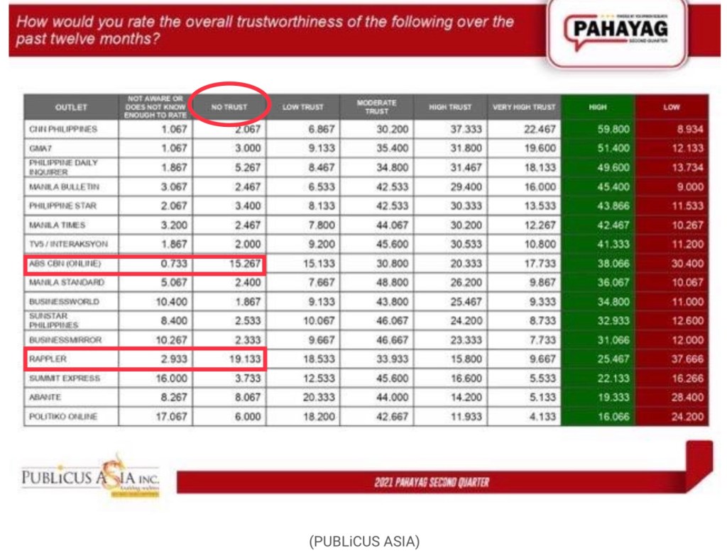 As can be seen the poll results, Rappler won gold, while ABS-CBN won silver in the “no trust” category.
