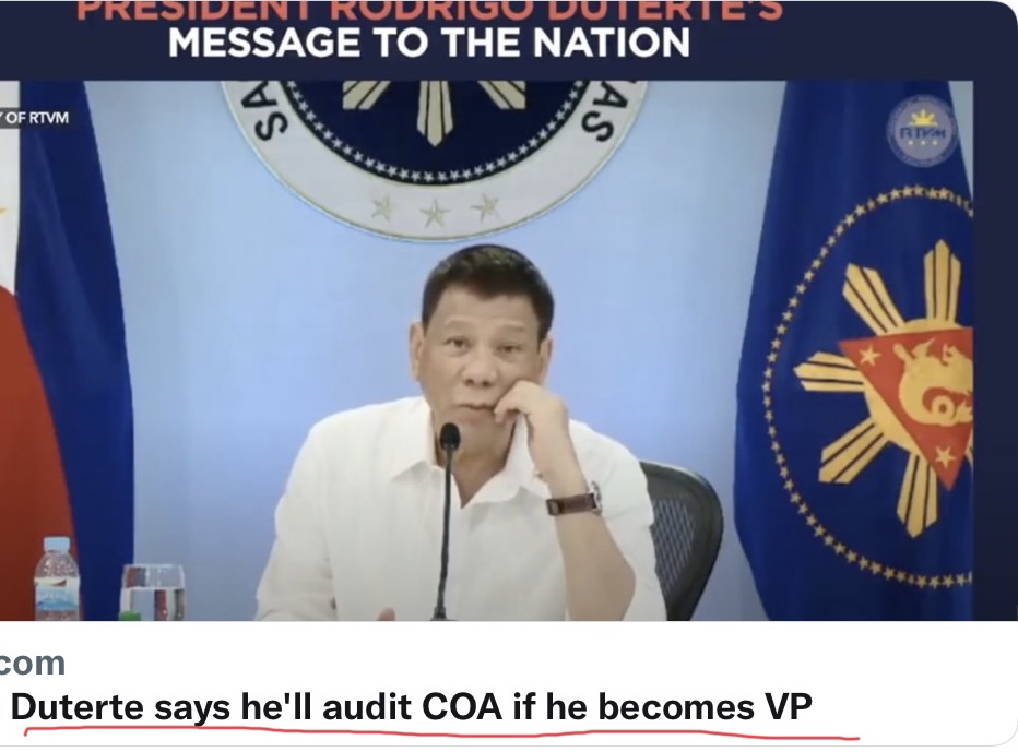 Earlier, Rappler reported that President Rodrigo Duterte said on national TV that he will audit the Commission on Audit (COA) if he becomes VP. (Duterte has “accepted” his nomination as the Vice Presidential candidate of the ruling party, PDP-Laban in next year’s national elections.)