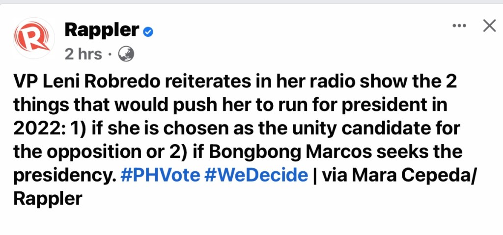 QUEZON CITY, Philippines (The Adobo Chronicles, Quezon City Bureau) – Rappler is reporting that Vice President Leni Robredo is not interested in running for President in 2022 to serve the Filipino people.