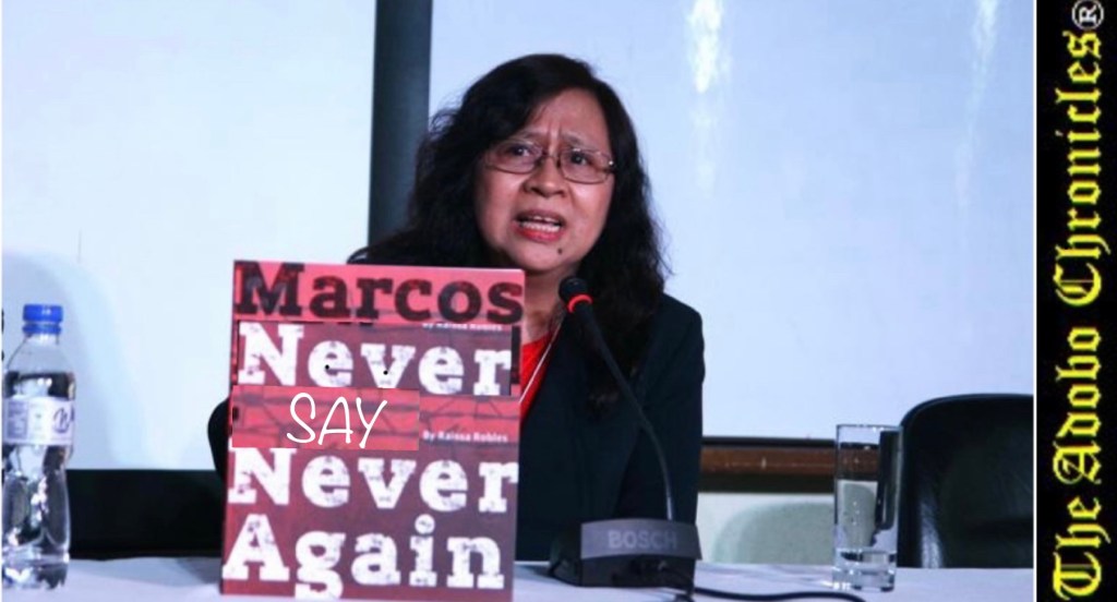 Her book, ”Marcos Martial Law Never Again” has become her battlecry and that of the tiny minions of mostly Dilawans (Yellows) who vowed that there will never be a return of the Marcoses in politics.