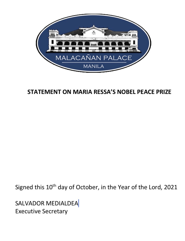 MANILA, Philippines (The Adobo Chronicles, Manila Bureau) – After several days of silence, Malacañan has finally issued an official statement on Maria Ressa’s winning the 2021 Nobel Peace Prize.