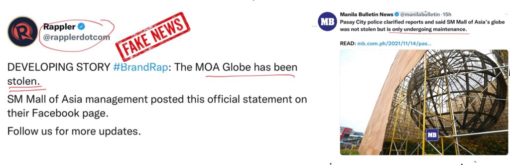 MANILA, Philippines (The Adobo Chronicles, Manila Bureau) – In its bid to be the first to report on a still developing, unconfirmed story, Rappler reported that the globe at the SM Mall of Asia was stolen. That fueled a lot of speculation and amazement on how such a giant structure could be lifted out of its location. Perhaps by helicopter or a high-towering crane?