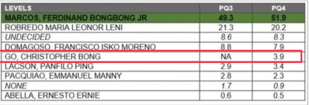 In the latest Publicus Asia poll, Marcos further increased his lead while Robredo’s numbers slid. Go, on the other hand, had a measly 3.9% which all but approximates the survey’s margin of error of plus or minus 3%.