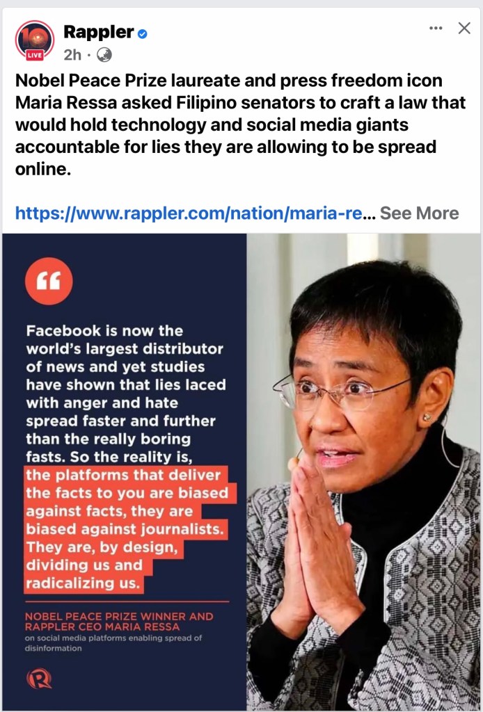 MANILA, Philippines (The Adobo Chronicles, Manila Bureau) – Nobel Peace Prize awardee Maria Ressa today asked Philippine lawmakers to craft a law that would censor the social networking giant Facebook.