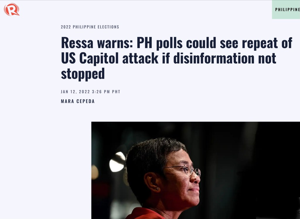 The CEO of the online news portal Rappler warned that if disinformation is not stopped, specifically in connection with the 2022 Philippine elections, Filipinos will troop to Washington, D.C. and launch another siege on the Capitol.