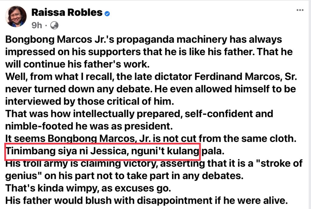 In a Facebook post criticizing Bongbong Marcos for skipping a televised taped interview with top Presidential candidates, Ressa said ”Tinimbang siya (Marcos) ni Jessica nguni’t kulang pala.” (Soho weighed Marcos but felt short.)