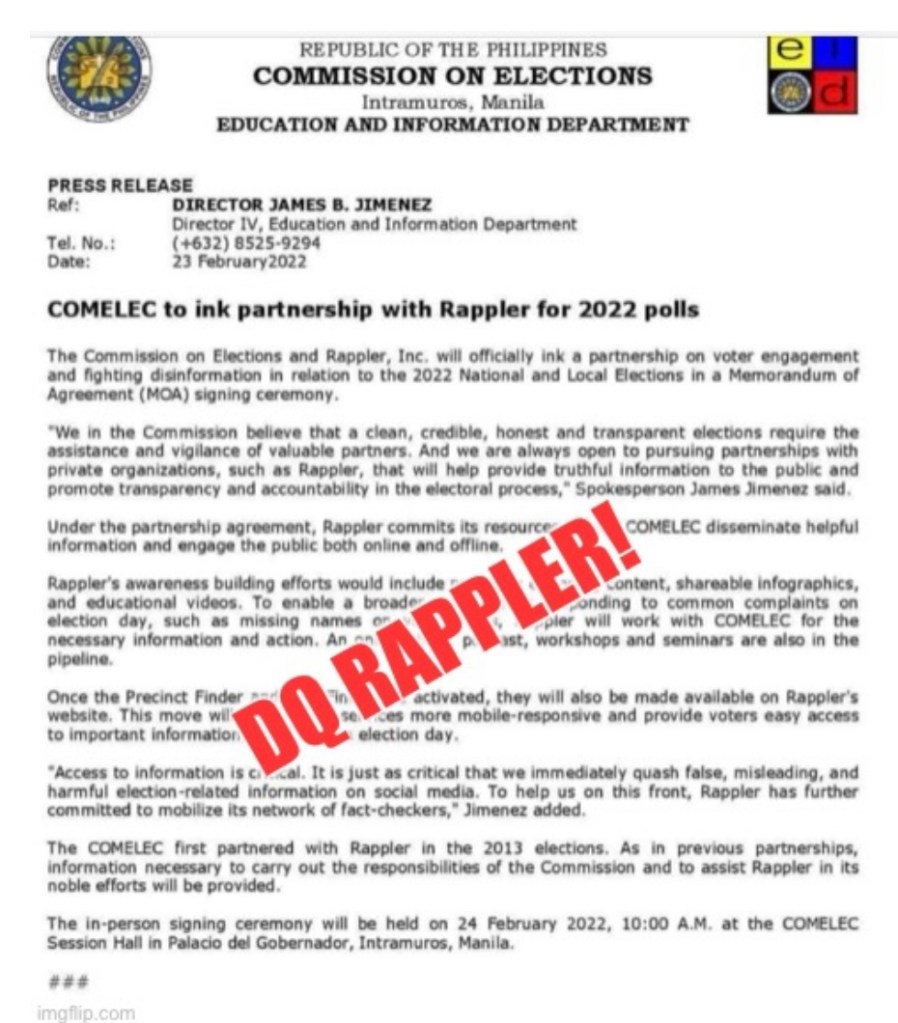 MANILA, Philippines (The Adobo Chronicles, Manila Bureau) – Just hours after the Commission on Elections (Comelec) announced that it had inked a partnership with blog Rappler for a voter engagement and to fight disinformation related to the May 9 elections, Filipino netizens are crying ”foul!”