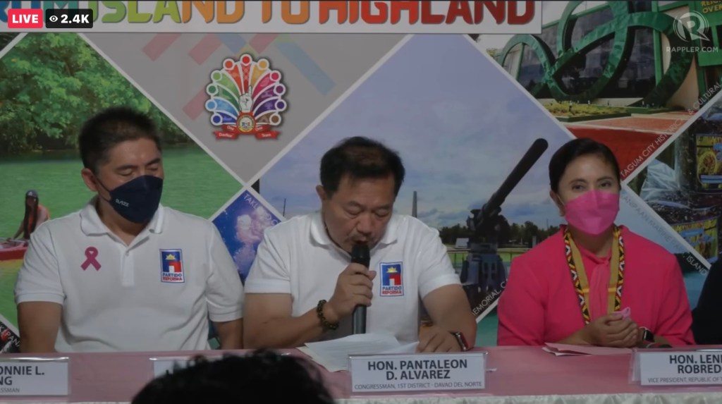 In making the announcement, former Speaker Pantaleon Alvarez extolled the party’s first choice Lacson before mentioning that it has decided to endorse Robredo as its second choice.